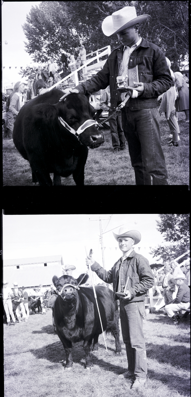Glenn Shoemaker, member of Future Livestock Club, shows off his grand champion first place winner in the senior division beef fitting and showing at the Twin Falls County Fair. He is wearing a jacket and a cowboy hat, and holding his trophy. His winning cow stands beside him. Some people are sitting on the bleachers behind him. Other men in cowboy hats are holding their cows by bridles in the background.