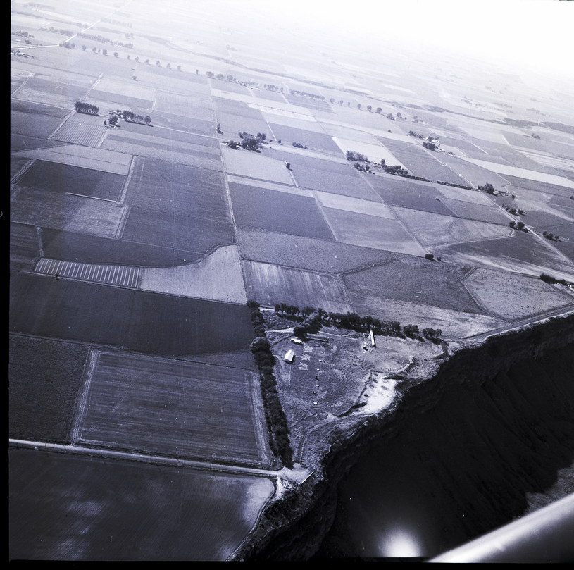 - An aerial view shows a small piece of annexed land sitting on the edge of a cliff. The land is lined by trees, and some buildings are on it. A road is visible at the bottom of the cliff face. Several roads, fields, and trees are visible in the aerial view.