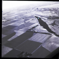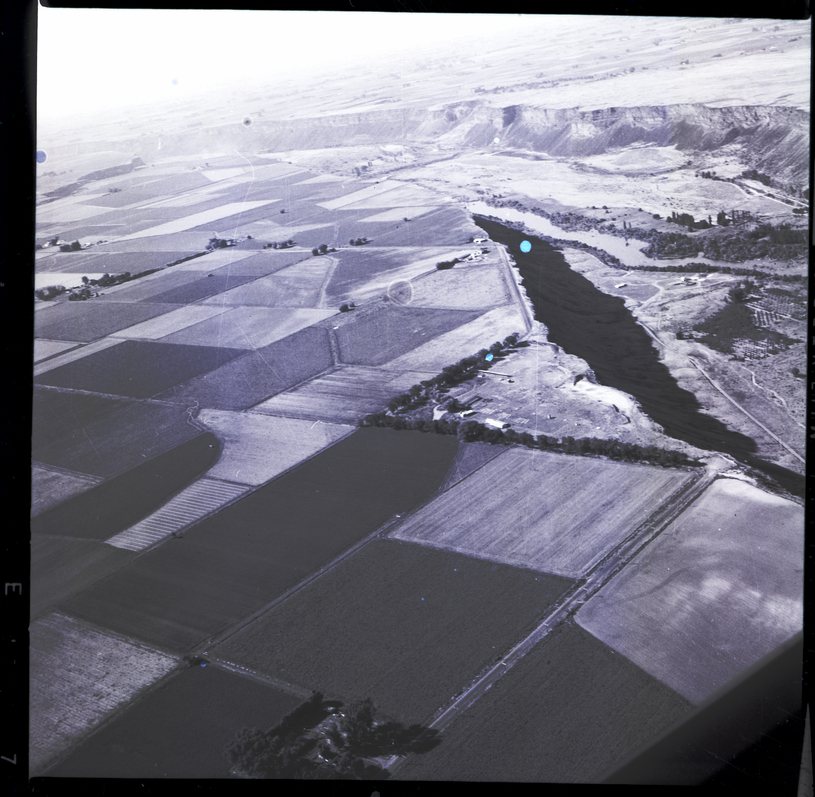 An aerial view shows a small piece of annexed land sitting on the edge of a cliff. The land is lined by trees, and some buildings are on it. A road is visible at the bottom of the cliff face, and beyond it is the Snake River. Several roads, fields, and trees are visible in the aerial view.