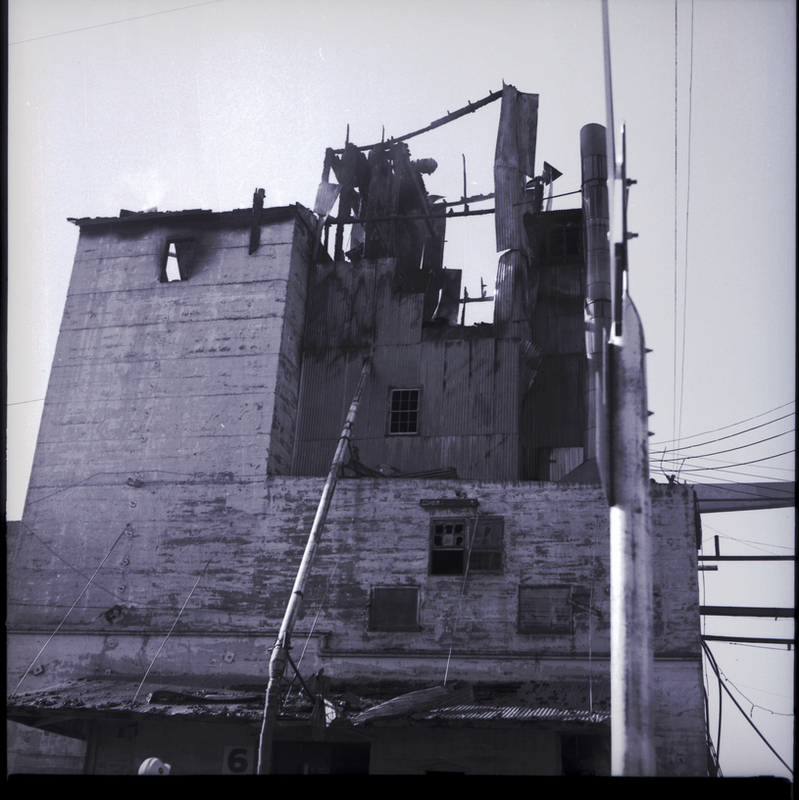 - The Shields Warehouse in Buhl shows significant damage after the building caught on fire. At the bottom of the image, a doorway labeled "6" and a man in a hard hat are visible.