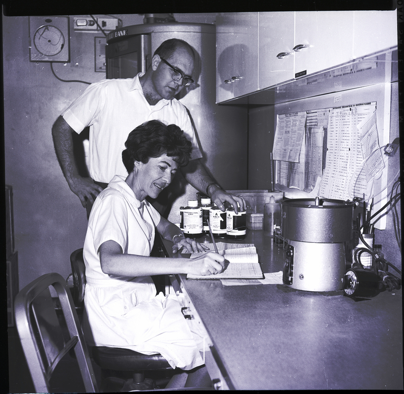 Lab technicians Art Busacker and Pat Hankins log in a shipment of blood at Magic Valley Memorial Hospital. Some bottles of blood are sitting on the counter, and the labels read "A Positive," "O," and "Citrated Whole Blood (Human)." Several diagrams and forms hang on a bulletin board above the counter, and above the bulletin board are some cupboards.
