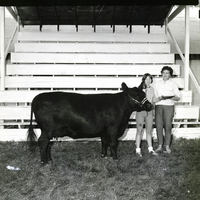Junior Angus Show Winner, Bonnie Honstead, left, receives an award for her senior yearling. The bowl was presented by Mrs. Samuel Thornton, on behalf of the Western States Angus Association. Bonnie Honstead, wearing a plaid shirt and shorts, holds the bridle for her black Angus cow, in a corral at the Twin Falls County Fairgrounds. Mrs. Thornton stands beside her, holding the award bowl. Some empty bleachers are behind them.