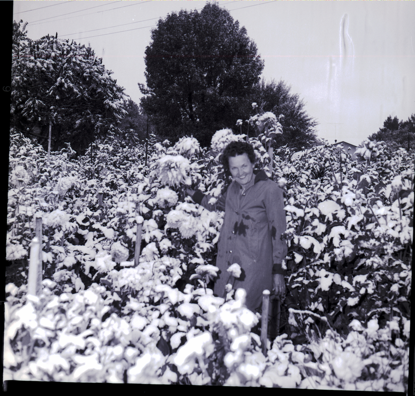Mrs. Howard Gillette, dressed in a long coat, stands in a garden looking over the snow-covered dahlias after the first heavy snowfall in Twin Falls. Mrs. Gillette won several ribbons at Twin Falls County Fair with her dahlias and worries about damage from the early snowfall. Several trees and bushes are in the background, the branches covered in snow.