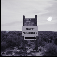 A wooden sign shows arrows pointing to the left for the direction of Castleford and Hagerman, and arrows pointing to the right for Murphy's Hot Springs and Clover Creek Crossing. Below then another sign as been added reading "Project Pre-Schooner II" with an arrow pointing to the right, showing the direction to the Project Pre-Schooner II site on Bruneau Plateau. Several rocks are below the sign, and in the distance behind it is a field of sagebrush.