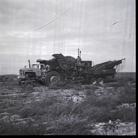 Harvesting potatoes near Jerome is one of several harvesters and crews of Charles Marshall. A two-row potato harvester truck is loaded with potatoes. Two men are at the front of the truck, while three others work in the back, looking over the potatoes. The truck is sitting in a field covered in dirt, weeds, and dead plants that stretches into the background.
