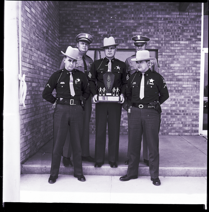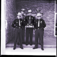 Members of the Idaho State Police pistol team show off their award trophy after winning first place at a pistol meet held at the National Reactor Testing site near Idaho Falls. From left to right, front row, are Larry Plott and James Gerke. From left to right, back row, are Robert Brown, Sgt. Marvin Snyder, team captain, and John Brewer. They are dressed in uniforms, and wear star-shaped badges. A brick building is behind them.