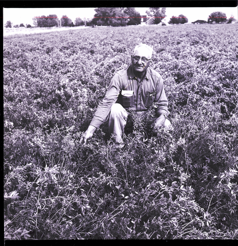 Edward Herzinger inspects from frozen alfalfa in a field. Mr. Herzinger estimates that the cold temperatures reduced his hay crop by at least 25 per cent. In addition, he said what hay was left was of lower quality because of the frost. A house and some trees can be seen in the background, beyond the field.