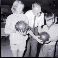 Frank Olsen, instructor for the Brunswick Learn to Bowl program at the Bowladrome, hands a bowling ball to Holland Houfburg Jr. Another boy stands behind him. Louise Parks stands beside them, holding a bowling ball. Behind the group some people can be seen seated in the bowling alley.