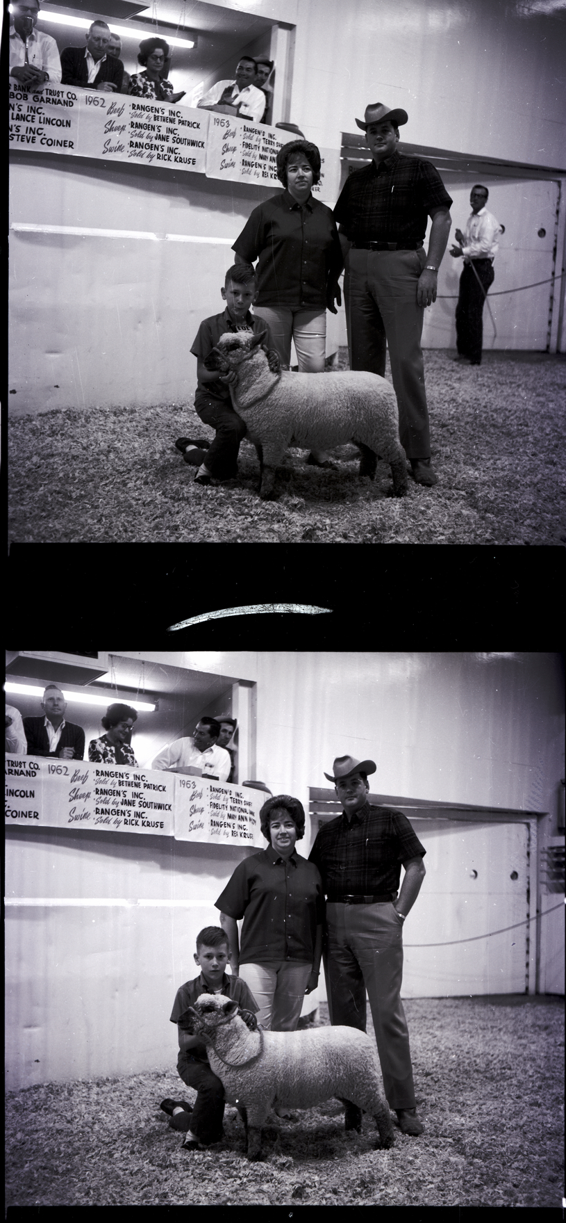 Jerome 4-H member Jeff Shewmaker kneels down beside his top sheep at the 4-H and FFA Fat Stock Show and Sale held at the Twin Falls Livestock Commission Company. Buyers Betty Locklear and John Locklear, of the Clear Span Construction Company, stand beside him. Several people look down into the show ring from above, and a banner hangs below them that reads "1962 Beef: Rangen's Inc. Sold by Bethene Patrick, Sheep: Rangen's Inc. Sold by Jane Southwick, Swine: Rangen's Inc. Sold by Rick Kruse. 1963 Beef Rangen's Inc. Sold by Terry Shaff, Sheep: Fidelity National Bank Sold by Mary Ann McCoy, Swine: Rangen's Inc. Sold by Rex Kruse."