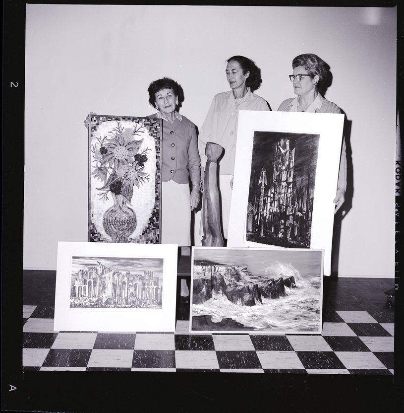 Mrs. Earl Peck, registration chairman. The art works are by Joe Mugnaini, Vesta Ward, and