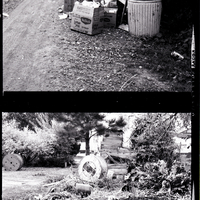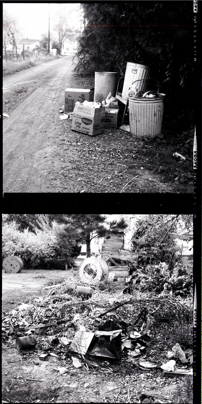 In the top image, some garbage cans and boxes are piled underneath a tree in an alley. On the other side of the road, weeds grow along the side of a fence, and a house and trees are in the background. In the bottom image, dead weeds, wire, tin cans, boxes, and wooden crates are piled up. Behind the junk, some trees and a house are in the background. A cleanup campaign of Twin Falls alleys is planned.