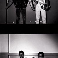 Ralph Pond and Kelly Nealon display the prizes for the Ford Punt, Pass, and Kick Contest. Ralph Pond holds up a jacket and a plaque that reads "Ford PP&K Championship Award First Place 1965, Age 11." Kelly Nealon holds a football helmet and football. The contest was sponsored by Union Motors and the Twin Falls Parks and Recreation Department, and boys between the ages of 8 and 13 may compete.