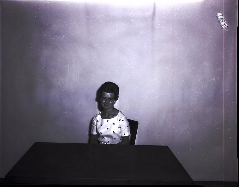 - Mrs. Eldon Evans, president of the Twin Falls chapter of the American Association of University Women, is seated behind a table. She is wearing a floral print dress.