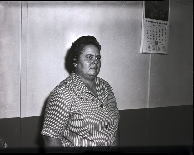 Mrs. Melvin Eslinger, president of the Twin Falls Christian Women's Fellowship of the First Christian Church, stands against a wall. She is wearing a striped button-up blouse. A calendar for the Union Pacific Railroad hangs from the wall.
