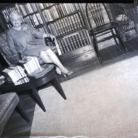 Mrs. John Hayes, president of the Twin Falls Ascension Guild of the Episcopal Church, sits in a recliner in a study. She is wearing a dress suit with a flower embroidered on the jacket. A bookcase is behind her, and beside her is a round table covered in books and a love seat. A fireplace is in the corner, and beside it are a vase and chair.
