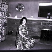 Mrs. John Leinen, president of the Ladies of the Elks, sits on a recliner in a living room. She is wearing a dress with a jungle print that shows palm tree fronds and parrots. Behind her is a fireplace, and on the mantle are a clock, some figurines, and a vase of flowers. A mirror hangs on the wall above the fireplace. Some curtains hang over a window to the side of the room.