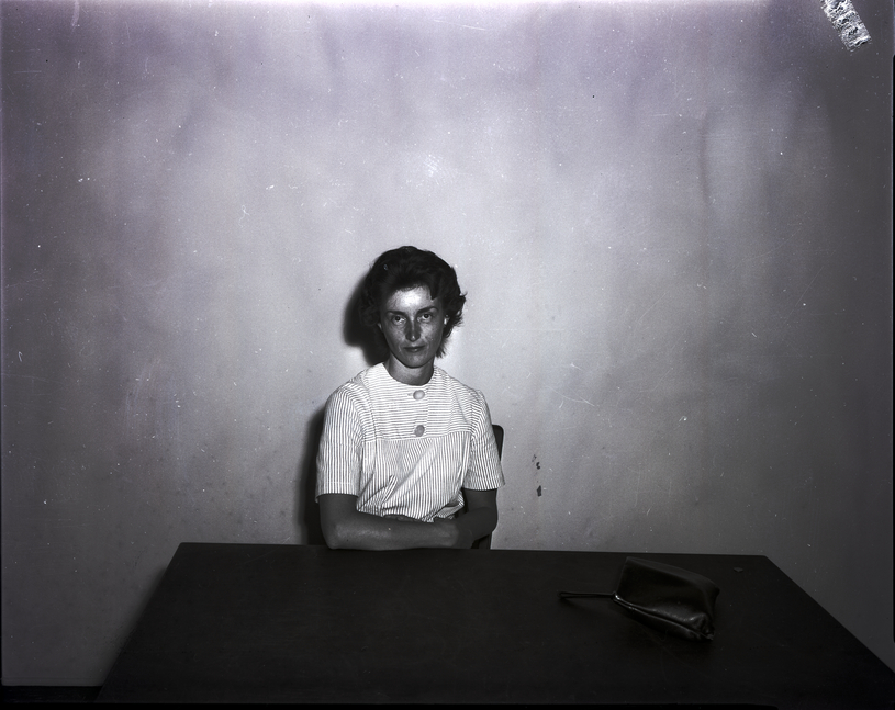 - Mrs. William Bolster, president of the Magic Toastmistress Club, sits behind a desk. She is wearing a striped dress. A purse sits on the table.