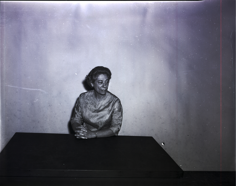 - Mrs. Wendell Grout, president of the Altrusa Club, sits behind a desk. She is wearing a patterned dress.