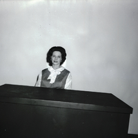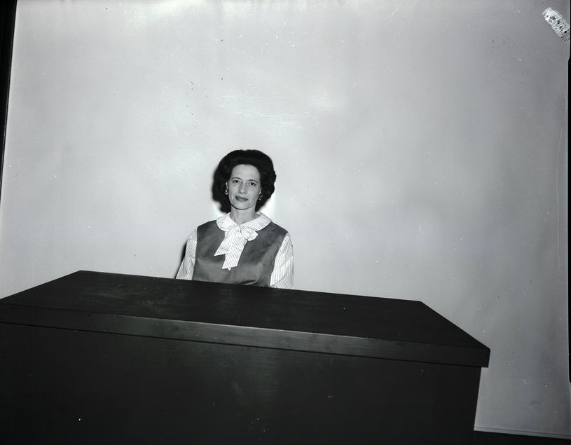 - Mrs. Kenneth F. James, president of the Twin Falls Lutheran Women's Missionary League, sits behind a desk. She is wearing a dress with striped sleeves and collar with a wide bow at the neck.