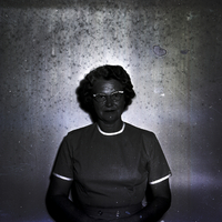 - Mrs. Eldred Taylor, president of the Countryside Flower Club, stands in a hallway. She is wearing a dress.