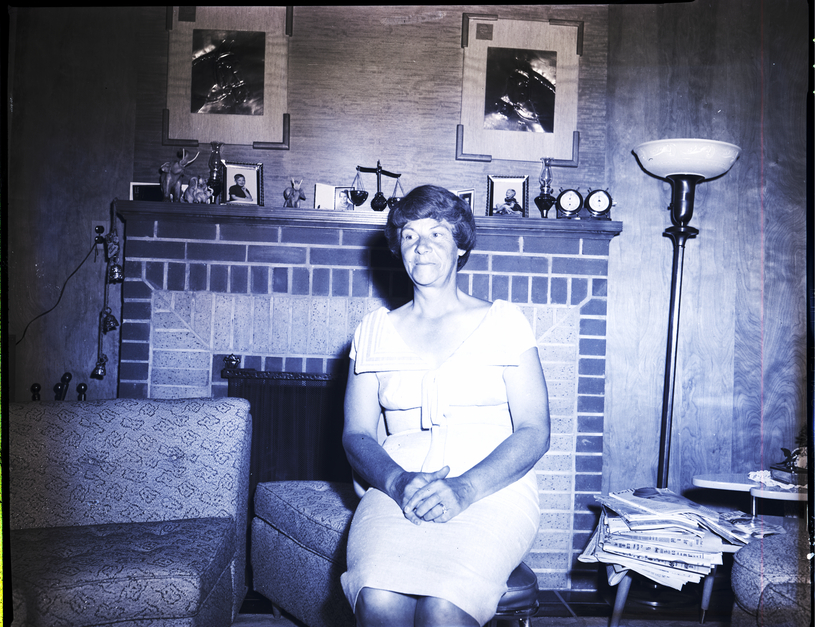 Mrs. Harold Morrison sits on a settee in a living room. She is wearing a dress. Beside her is a couch and a stand covered in newspapers. A lamp sits in the corner. Behind her is a fireplace, and on the mantle are some framed photographs, glass elephant figurines, a small scale, and a clock. Two framed pictures hang on the wall above the fireplace.