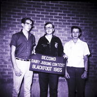 Three members of the Declo FFA chapter hold up a banner reading "Second Dairy Judging Contest, Blackfoot 1965" after winning second place in the Eastern Idaho State Fair dairy judging contest. From left to right are Edward Hatch, Max Fuqua, and Stanley Schiewe. Max Fugua is wearing his FFA jacket.