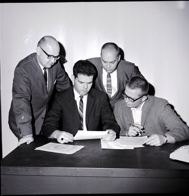 Studying the amount spent by the Twin Falls Red Cross chapter during 1964 are four board of directors of the chapter. From left to right are William Boyd, public information chairman; William K. Evans, vice chairman; LuDell Waldron, treasurer; and Milo Pope, chairman. The Twin Falls chapter is a participating agency of the United Fund. The four men are dressed in suits and ties. A telephone sits on the desk.