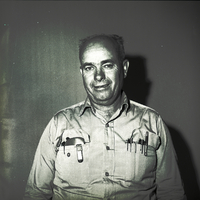 Claude H. Pair spoke about the development of land under sprinkler irrigation in the Snake River Plain as a big business during the Western annual meeting of the American Society of Civil Engineers and American Society of Agricultural Engineers held in Twin Falls. He is wearing a button-up shirt with several pens, a comb, and a case in the front chest pockets.