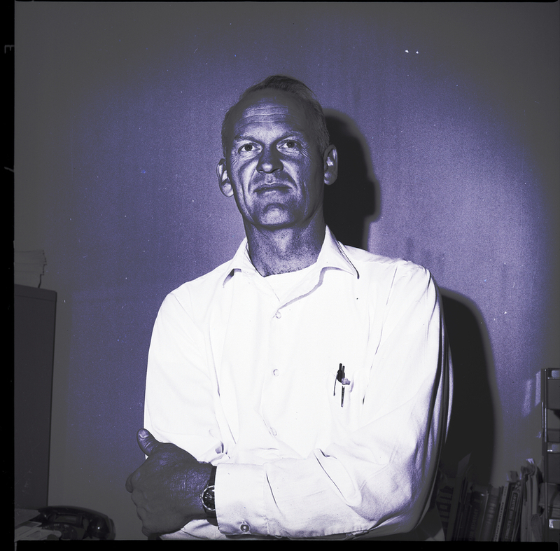 James Bondurant, research agricultural engineer at the Snake River Conservation Research Center in Kimberly, spoke about the need for better irrigation systems at the Western annual meeting of the American Society of Civil Engineers and American Society of Agricultural Engineers held in Twin Falls. He is wearing a button-up shirt with pens in the front chest pocket. Behind him is a bookcase of books and a desk with a telephone on it.
