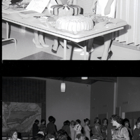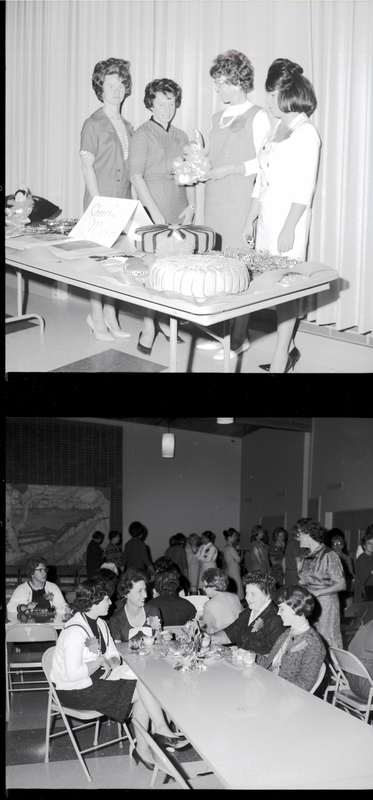 In the top image, four women stand beside a table at a YWCA Wives Club event. From left to right are Mrs. Earl Hoffman, Mrs. B. Prescott, Mrs. Keith Gull, and Mrs. Richard Howard. Several crafts are on the table, and a sign on the table reads "Cheerful Matrons." Mrs. Gull holds a clown doll. In the bottom image, a large group of women gather in a gymnasium. Several are seated in folding chairs at tables, drinking tea. From left to right are Mrs. James Hall, Mrs. Frank Robinson, Mrs. Russell Cunningham, and Mrs. William Routh. On the tables are centerpieces of autumn leaves. A line of women snakes around the back of the gym. On the far back wall is a display of a drawing of a tree beside a wooden fence, loosing its leaves. The women are wearing dresses and name tags in the shape of autumn leaves.