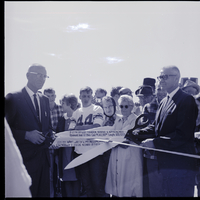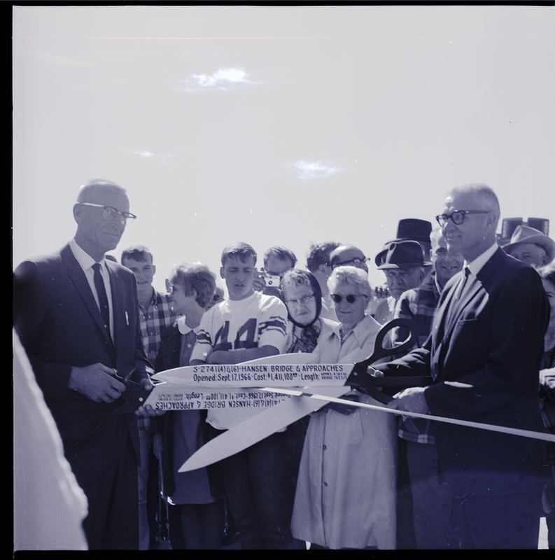 Cutting the ribbon to open the new Hansen Bridge on State Highway 50, north of Hansen, are from left to right, Willard Lattimer, chairman of the Jerome County Commission, and Morris Carlson, chairman of the Twin Falls County Commission. They are wearing suits and ties hold pairs of large scissors that read "S-2741(4)&(6) - Hansen Bridge and Approaches, Opened: Sept. 17, 1966 - Cost: $1,411,100.00." A crowd of men and women have gathered to watch.