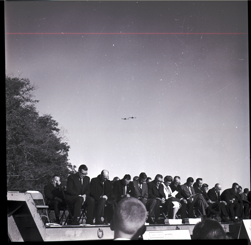 A group of men dressed in suits and ties, including Govenor Smylie, Congressman Hansen, and Senator Jordan, and a woman in a dress sit in folding chairs on stage with their heads bowed, observing a moment of silence, at the Jerome Road dedication. Two planes fly by above them. The heads of spectators can be seen in front of the stage, and behind it are some trees.