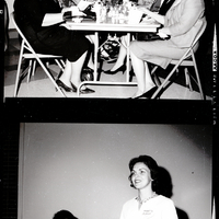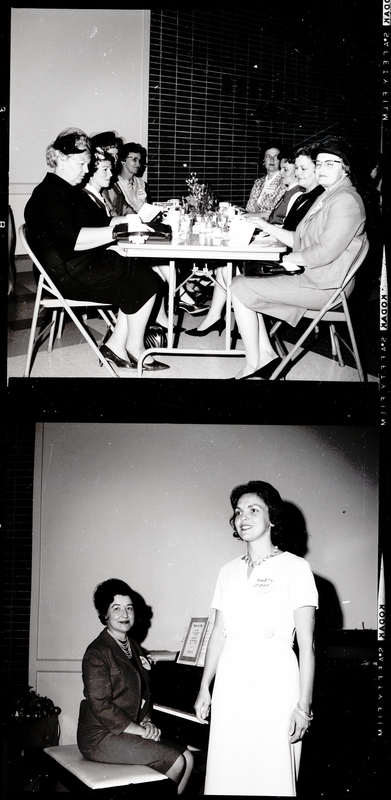 Women gather at a Christian Women's Club luncheon held at the Twin Falls YWCA. In the top image, several women wearing dresses and hats sit in folding chairs around a table, looking at some programs and drinking tea. The women sitting toward the back of the table have visible name tags that read "Opal Robins" and "Beth Larsen." On the table are water glasses, tea cups, salt and pepper shakers, and a vase with flowers. In the bottom image, Mrs. David Mead, wearing a white dress, stands beside a piano. Sitting at the piano is Mrs. Donald Youtz, dressed in a jacket, skirt, pearls, and hat. Sitting on the piano is a piece of music, "Come to Ale." Mrs. Mead was a featured soloist at the luncheon, accompanied by Mrs. Youtz.