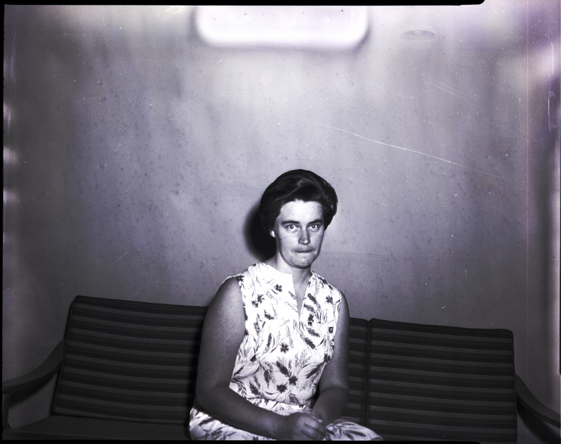 - Mrs. Robert Van Wormer, president of the Twin Falls Epsilon Sigma Alpha Alpha Beta Chapter, sits on a couch. She is wearing a floral print sleeveless dress.