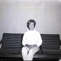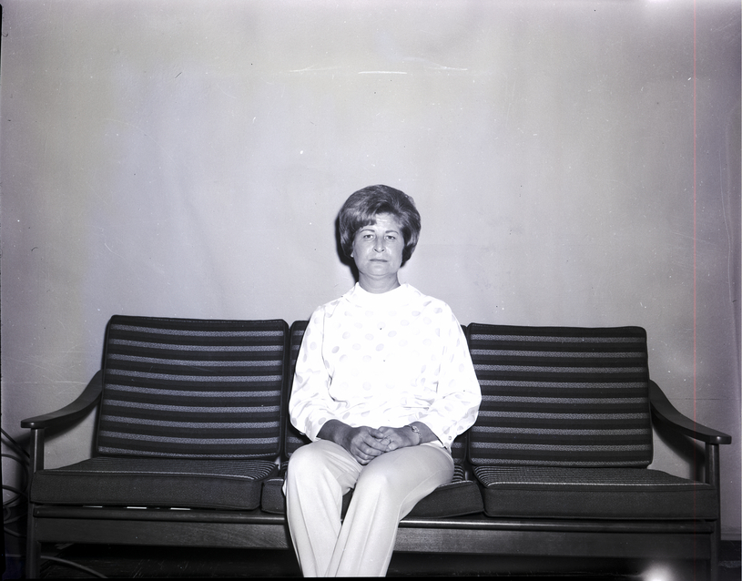 - Mrs. Clarence Green, president of the Squilla Club, sits on a couch. She is wearing a sweater and slacks.