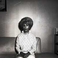 Mrs. Marvin Adams, president of Typographical Union No. 241, sits on a couch. She is wearing a floral print shirt and slacks. In the corner is a display case filled with figurines. On top of the display case is a photograph and a lamp. A framed landscape painting hangs on the wall above her.