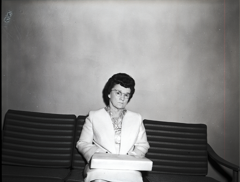 - Mrs. Morris Vavold, president of the Nazarene World Missionary Society of the Twin Falls First Nazarene Church, sits on a couch. She is wearing a blouse, jacket, and skirt. A package sits on her lap.