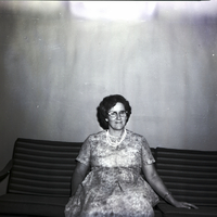 Church, sits on a couch. She is wearing a floral print dress and a pearl necklace.