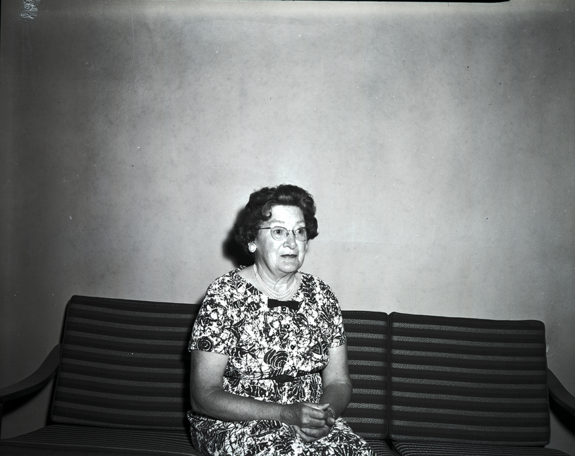 Mrs. Mary Stearns, president of the Twin Falls Triple Link Club, a subordinate to Primrose Rebekah Lodge No. 76, sits on a couch. She is wearing a floral print dress and a pearl necklace.