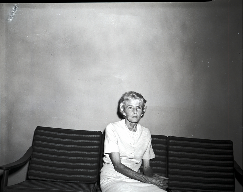 - Mrs. Alfred House, president of the MS and S Club, sits on a couch. She is wearing a white button-up top and skirt.