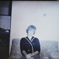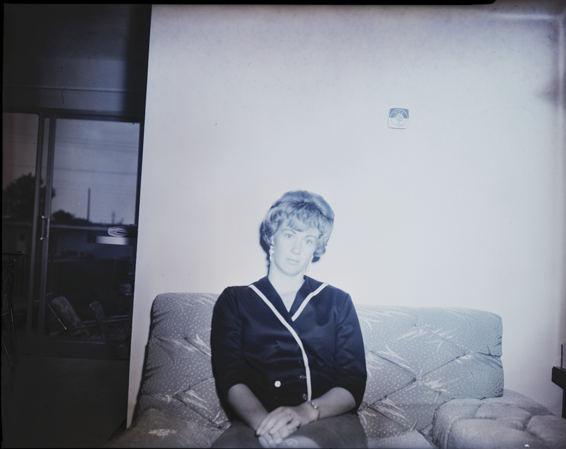 Mrs. Quintin Harral, president of the Creative Y Wives, sits on a couch. She is wearing a black blouse and skirt. Another room is seen through a doorway to the left. Beyond the sliding glass doors, the backyard and some of the other houses in the neighborhood are visible.
