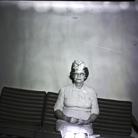 Mrs. Robert Messenger, president of the Twin Falls Auxiliary to Veterans of Foreign Wars, sits on a couch. She is wearing a Veterans of Foreign Wars Auxiliary uniform dress and cap.