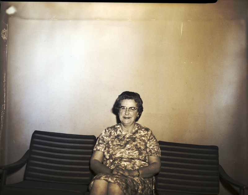 Mrs. Earl Shobe, oracle of the Vishnu Camp No. 2970 of the Twin Falls Royal Neighbors of America, sits on a couch. She is wearing a floral print dress.