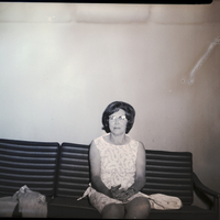 Mrs. Robert Tucker, president of the Eva Marie Guild, a mission study group within the Christian Woman's Fellowship of the First Christian Church, sits on a couch. She is wearing a patterned sleeveless dress. A jacket and a purse are sitting on the couch beside her.