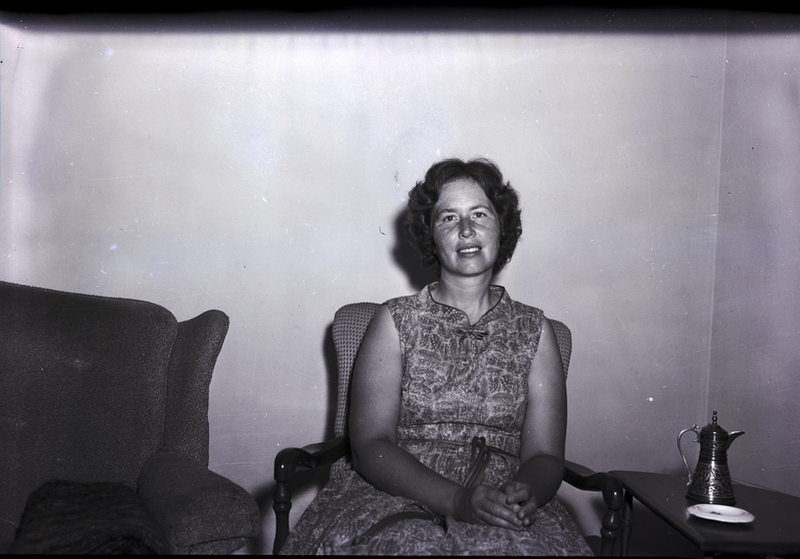 - Mrs. A. R. Robinson, president of the Home Economics in Homemaking, sits on a chair. She is wearing a patterned sleeveless dress. On one side of the chair is a couch, and on the other side is a small stand that has a silver teapot and ash tray on it.