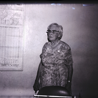 - Mrs. Jessie Davis, president of the Salmon Social Club, stands beside a wall. She is wearing a floral print dress. Hanging on the wall beside her is a map of the state of Idaho that reads "Idaho Legislative and County Officials -- 1965-1966."