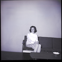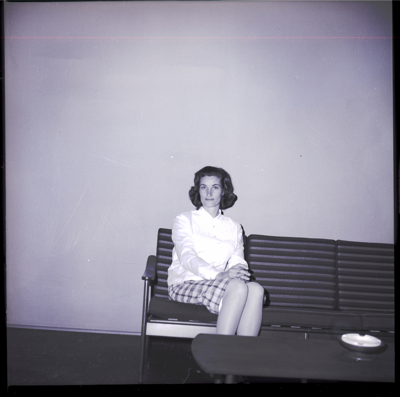 - Mrs. Russell Smedley, president of the Modern Mrs. Club, sits on a couch. She is wearing a white blouse and a plaid skirt. There is a table in front of the couch, and on the table is an ash tray.