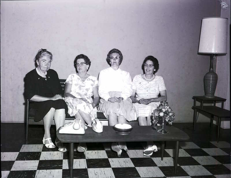 Officers of the Country Woman's Club sit on a couch. From left to right are Mrs. L. V. Nicholson, corresponding secretary; Mrs. Edward Waite, secretary; Mrs L. E. Bird, vice president, and Mrs. Carrie Modlin, president. All the women are wearing dresses. In front of the couch is a table, and on it are a telephone, ash tray, and centerpiece of fruits and flowers. On a stand to the side of the couch is a lamp.