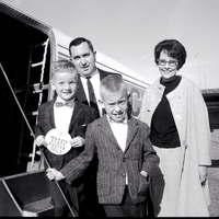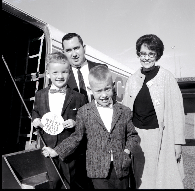 Richard Messersmith, Muscular Dystrophy publicity chairman, and Mrs. Clifton Peterson, Magic Valley Muscular Dystrophy campaign chairman, stand behind Idaho Muscular Dystrophy campaign poster boys Grant and Douglas Jacobsen as they board a plane for Boise. The boys will visit Governor Robert E. Smylie while in Boise. Grant Jacobsen holds a sign reading "MDAA's State Poster Child." The boys are wearing bow ties, slacks, and jackets. Mr. Messersmith is wearing a suit and tie and Mrs. Peterson is wearing a blouse, skirt, and long jacket.