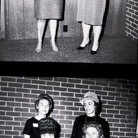 In the top image, Mrs. Charlotte Crockett and Mrs. William Kinsey provide musical entertainment at a luncheon meeting for the newly organized Twin Falls Cowbelles held at the Depot Grill. Mrs. Crockett is wearing a dress, and Mrs. Kinsey is wearing a top and skirt and is holding a guitar. In the bottom image, standing from left to right are Mrs. Larry Lickley, president-elect of the local Cowbelles group, and Mrs. Cecil Brim, courtesy chairman. Seated from left to right are Mrs. Harry Eaton and Mrs. Ralph Olmstead, secretary-treasurer of the local unit. They are wearing blouses and skirts and two of the women are wearing hats. A print of a cubist painting rests against the wall behind them.